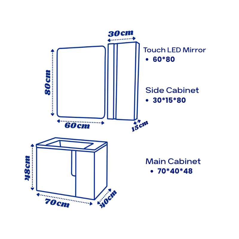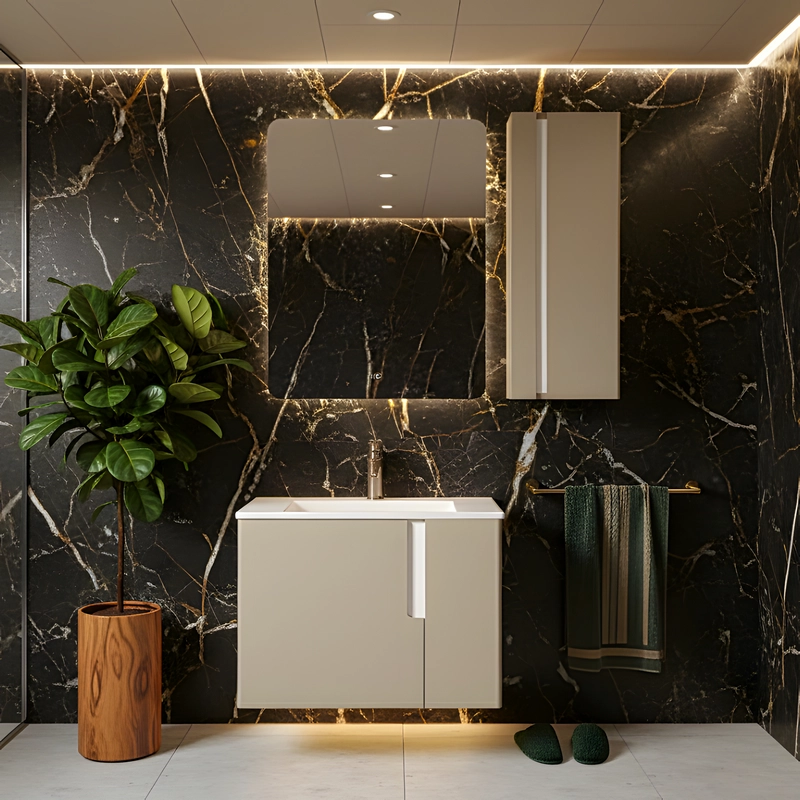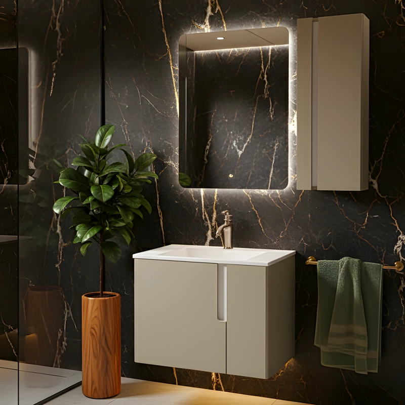 - طراحی لوکس و مینیمال: رنگ شیک، جزئیات شیار فرو رفته برای باز شدن درب و آینهای با نورپردازی حرفهای، جلوهای خاص به حمام یا سرویس شما میبخشد.