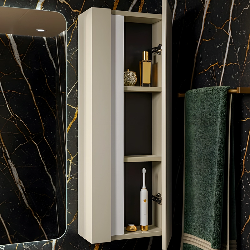 - باکس کناری مجزا و عمودی: این محصول دارای یک باکس کناری مستقل و عمودی است که در سمت راست آینه قرار میگیرد. این باکس دارای یک شیار عمودی فرو رفته سفید رنگ در سمت چپ است که علاوه بر اینکه به زیبایی و جذابیت ظاهر مدرن باکس افزوده است، به عنوان دستگیره عمل کرده و درب باکس از همانجا باز میشود. این باکس فضای ذخیرهسازی اضافه برای اکسسوریها، حولهها و لوازم شخصی را فراهم میکند و طراحی عمودی آن، به افزایش ظرفیت ذخیرهسازی بدون اشغال فضای زیاد کمک میکند.